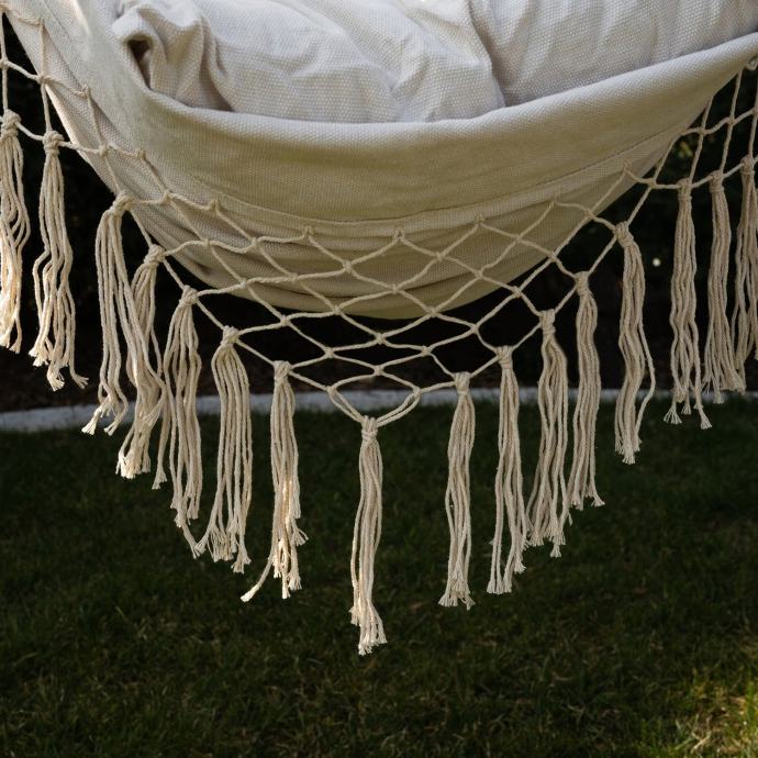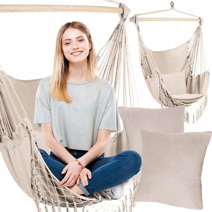 Izdržljivi materijal - pamuk osigurava odgovarajuću ventilaciju, što povećava udobnost korištenja suspendirane stolice čak i u vrućim danima. Izdržljivost sjedala brine se poliesterskim dodacima. Čvrsti montažni prsten povezan je s izdržljivim konopcima, ravnomjerno raspoređenim na stranama viseće mreže kroz drvenu prečku. Ovaj dizajn olakšava objesiti, a viseća mreža je dobro uravnotežen i stabilan.