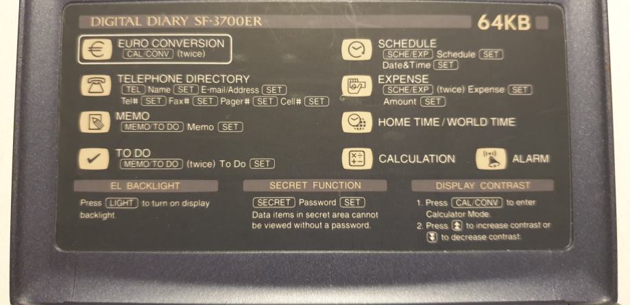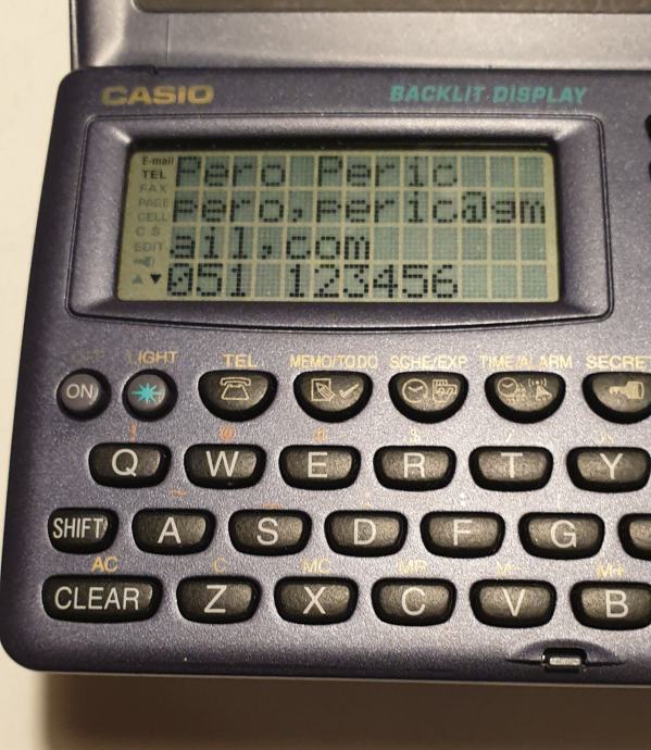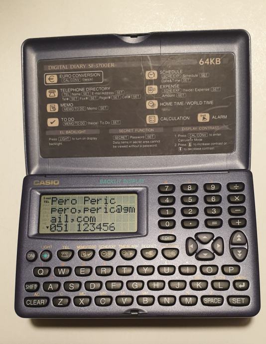 Prodajem ispravan, neoštećen vintage CASIO elektronski rokovnik/organizator (Digital Diary) model SF-3700ER, kapaciteta memorije 64 KB. Instalirane su dvije nove litijeve baterija CR2032.