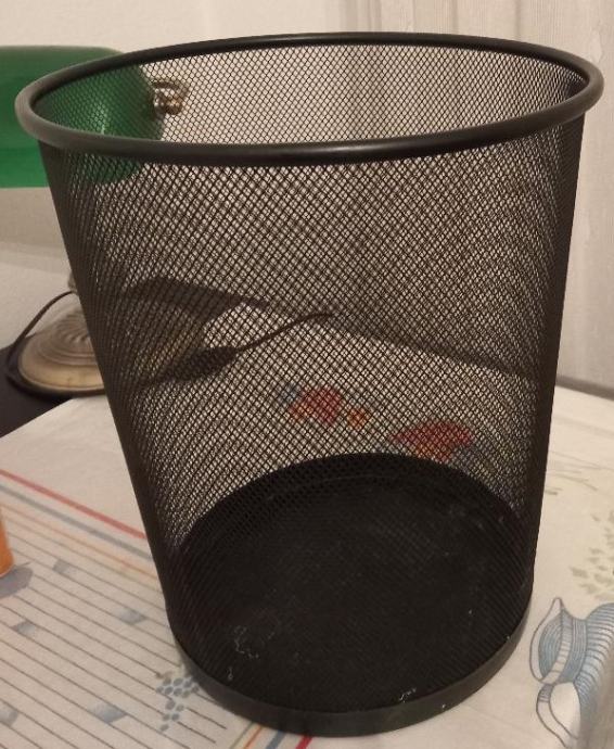 Prodaje se kompaktan koš za uredski otpad, dimenzije: širina (promjer) pri vrhu 29 cm, širina pri dnu 24 cm, visina koša je 34,5 cm. Mrežica je sitna, lakirana. Dno nije mrežasto.