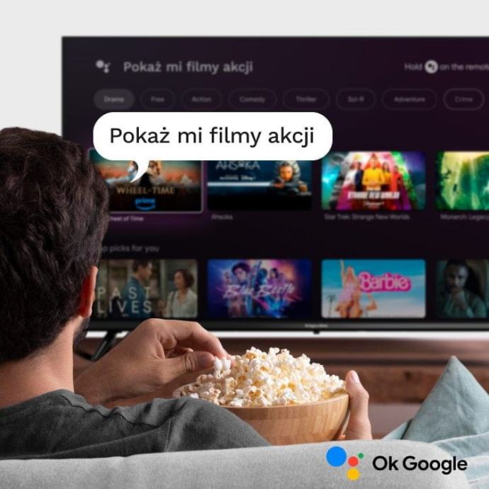 TV Kruger & Matz KM0250UHD-SI postat će vaš vodič za pronalaženje pravog sadržaja. Pritisnite gumb za pretraživanje glasa na daljinskom upravljaču i postavite pitanje ili zatražite film koji želite pogledati i odgovore ćete dobiti izravno na zaslonu.