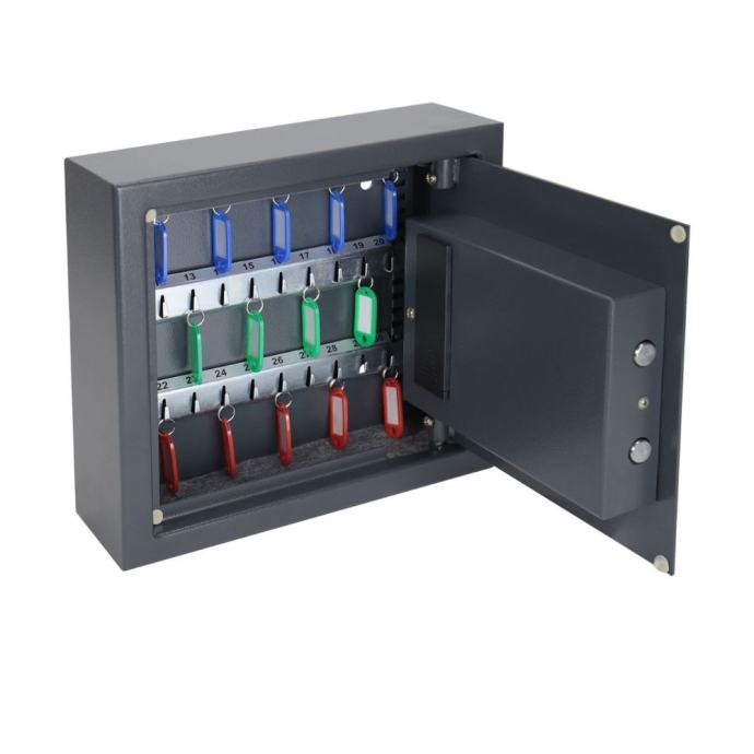 Uz naš sef dolazi s sve što vam je potrebno za brzu i jednostavnu montažu na zid, uključujući i 30 privjesaka za ključeve u različitim bojama za lako prepoznavanje. Praškasti premaz u antracit boji osigurava dugotrajnu zaštitu od ogrebotina.