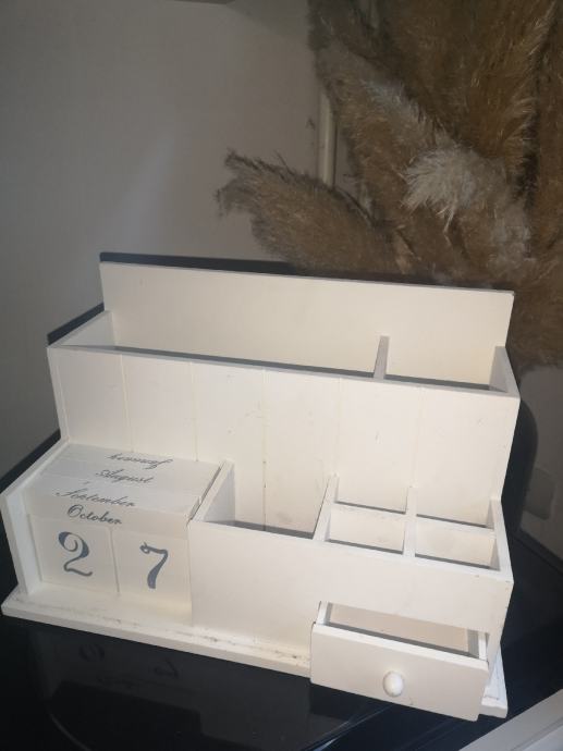Drveni stalak za papir i olovke s kalendarom (2 kocke s brojevima za datume, 3 kvadra za mjesece) i malom ladicom.