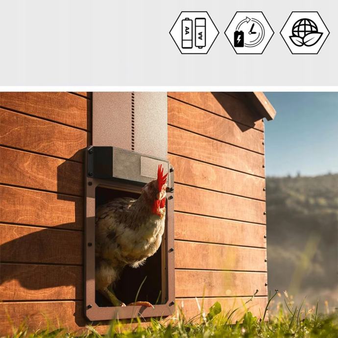 Ova vrata rade s ugrađenim sumrak, što znači da se automatski otvaraju u zoru i zatvaraju u sumrak. Ovo je pametno rješenje jer se prilagođava promjenama u sezonama i omogućava vašim kokošima da se uvijek slobodno kreću i sigurno se vrate kući. Pouzdan mehanizam osigurava da su vrata potpuno zatvorena, učinkovito štiteći vaše kokoši od noćnih grabežljivaca poput lisica ili zečeva.
