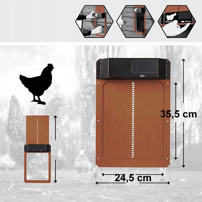 Vrata su 35x24 cm dimenzije, što je pogodno za većinu kokoši. Izrađene su od izdržljivog materijala u hrđi koja će se diskretno miješati s prirodnim okolišem. Napajanje je jednostavno jer rade na baterijama. Vrata je lako instalirati i koristiti, što ih čini idealnim za iskusne uzgajivače i početnike.