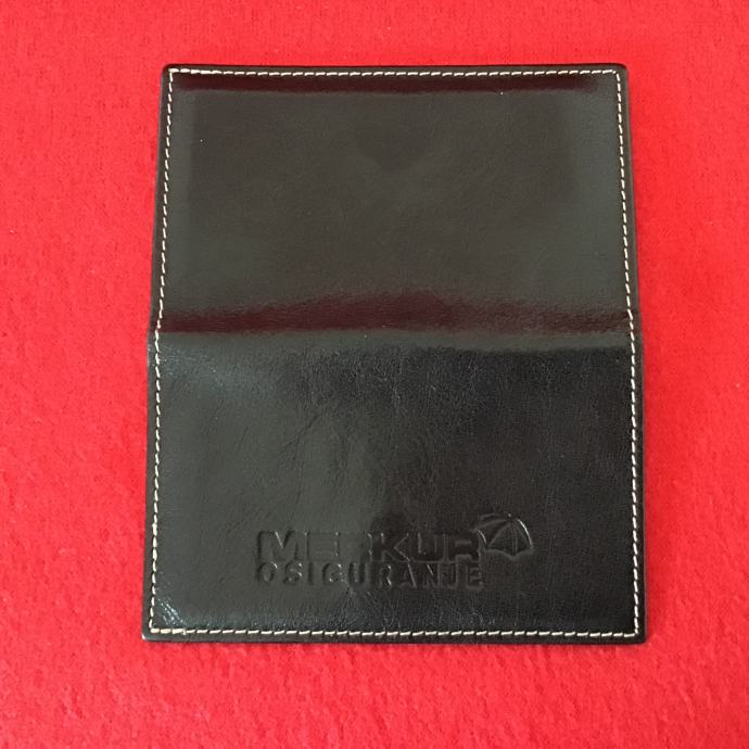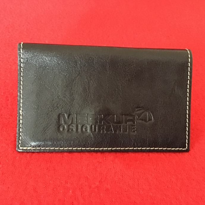 Business card case leather black, folding velcro, with the inscription MERKUR OSIGURANJE.