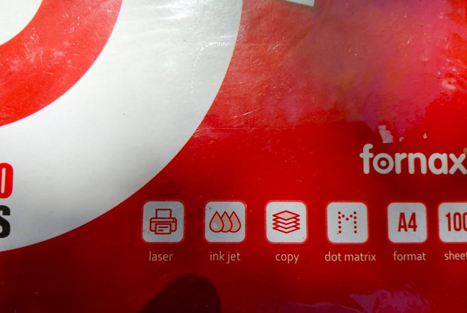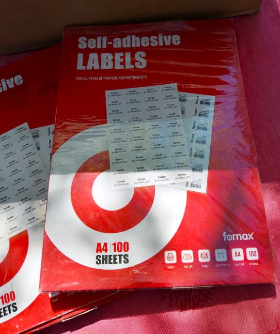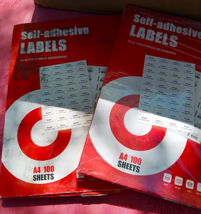 Fornax dva paketa A4 etiketa za sve printere i kopir aparate jedan paket ne raspakiran iz drugog fali par listova. Cijeli papir A4 je jedna naljepnica, printate i režete po veličini koja vam treba !