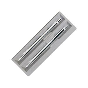 Klasična Parker original pisaća garnitura, sastoji se od kemijske i tehničke olovke koje su kompletno izrađene od nehrđajućeg čelika (inoxa). Parker original kemijski uložak osigurava ugodno pisanje i vrhunsku kvalitetu ispisa. Tehnička olovka ima debljinu ispisa od 0.5 mm. Garnitura dolazi u elegantnoj kartonskoj poklon kutiji. Dostupna je samo u srebrnoj boji.