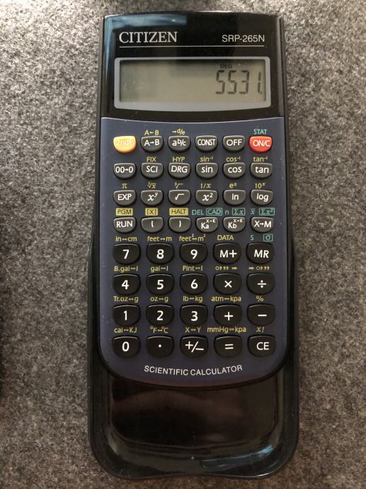 Znanstveni i školski kalkulator Citizen SRP-265N. Kalkulator ima 10 znamenki, 129 funkcija i odličan je kako za učenike osnovnih, tako i učenike srednjih škola. Također pogodan za znanstvenike te sve kojima su potrebne funkcionalnosti ovog kalkulatora. U odličnom stanju sa novom nedavno promijenjenom baterijom.