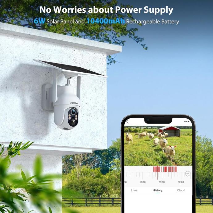Kamera je opremljena autonomnim napajanjem koje omogućuje rad čak i u uvjetima nepovoljnih vremenskih prilika. Sa solarnim panelom od 6W i baterijom od 10400 mAh, naša 4G kamera osigurava neprekidno napajanje. Sa 3 sata izravne sunčeve svjetlosti dovoljno je za dnevne potrebe napajanja, čineći je idealnim rješenjem za vikendice, skladišta, imanja, gradilišta, staje i mnoga druga mjesta bez struje ili Wi-Fi-a.