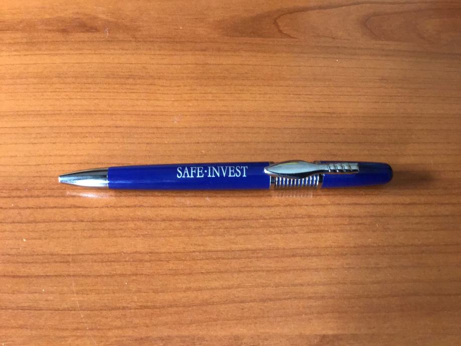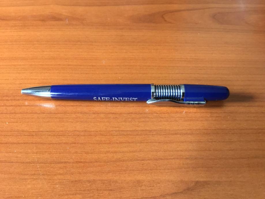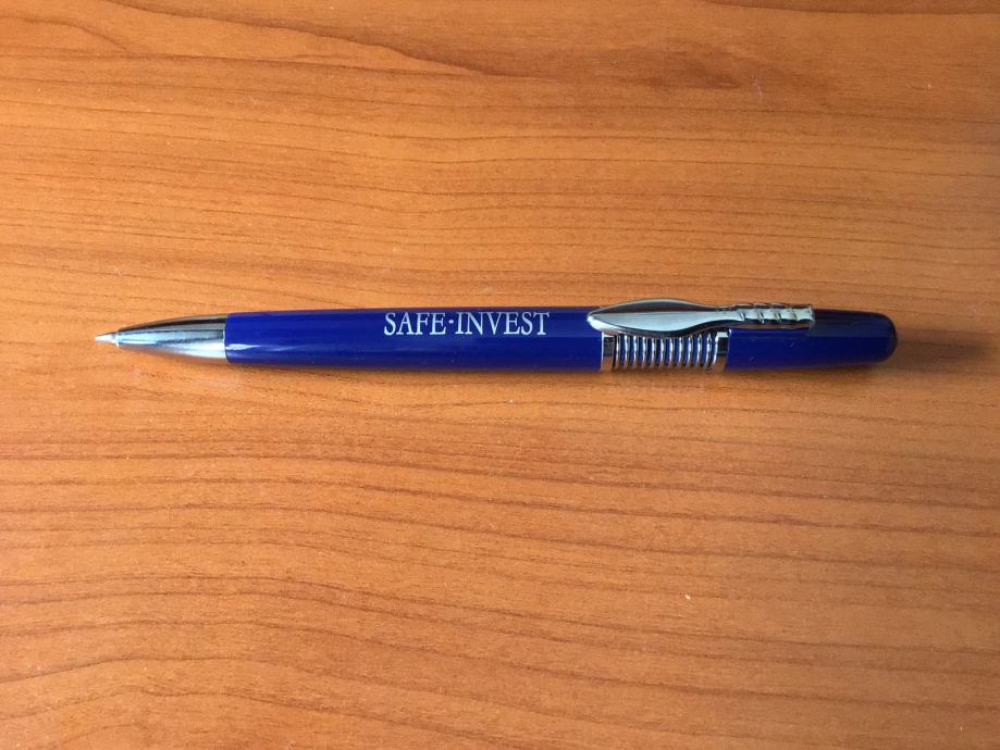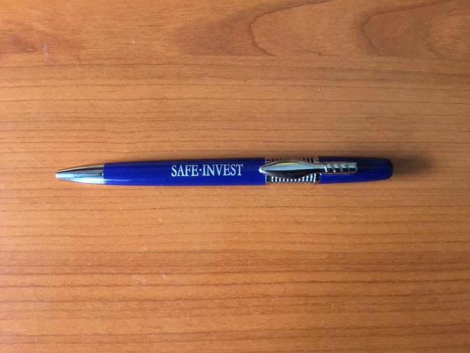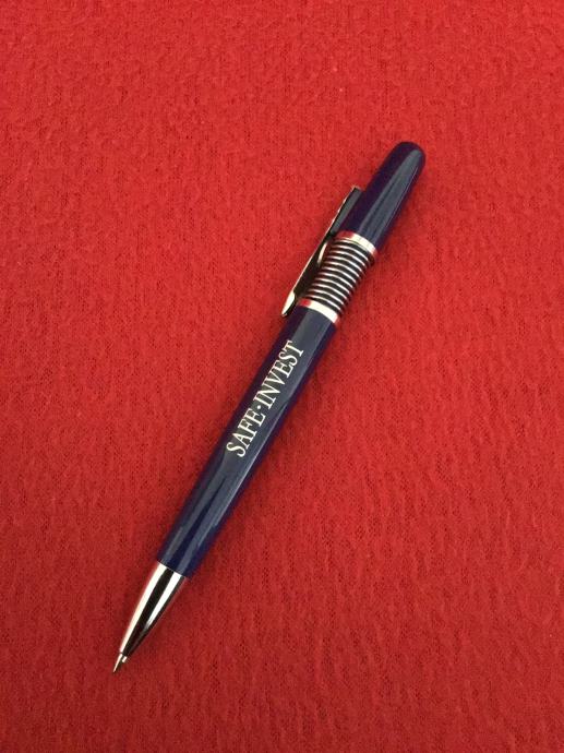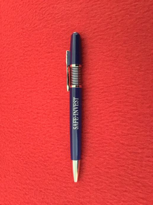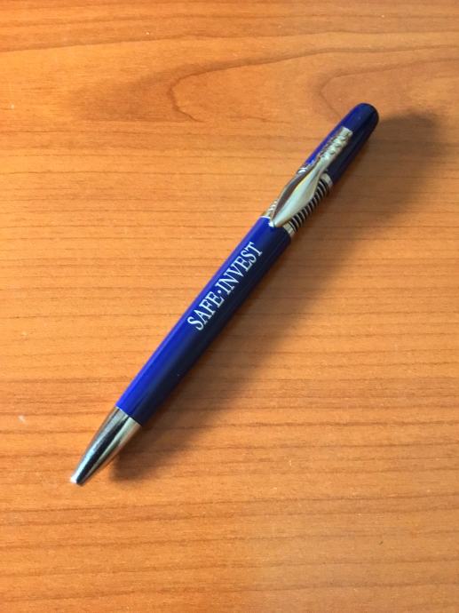 Stara kemijska olovka, plave boje, s logom SAFE-INVEST.