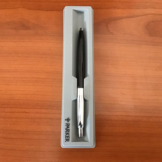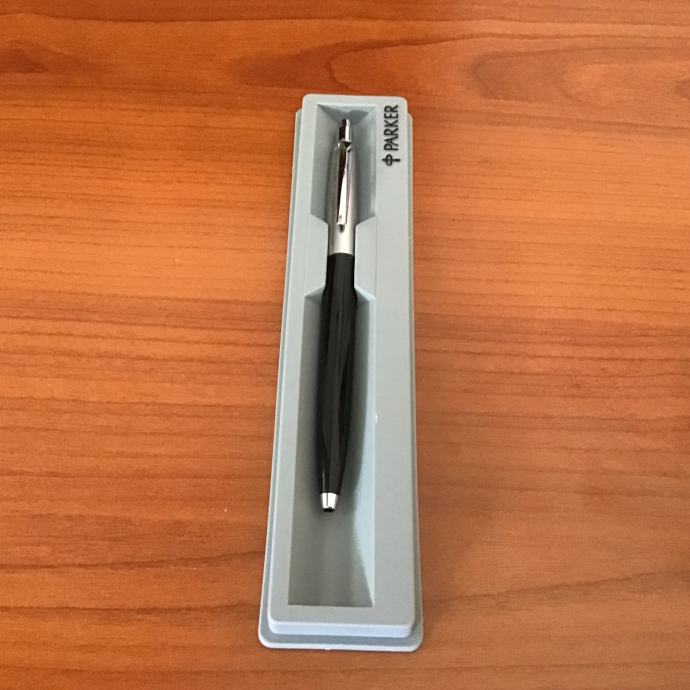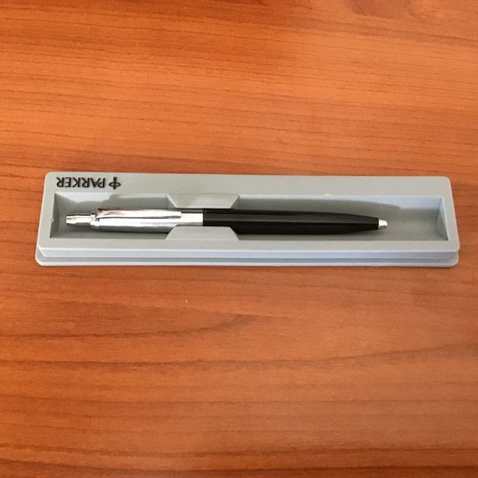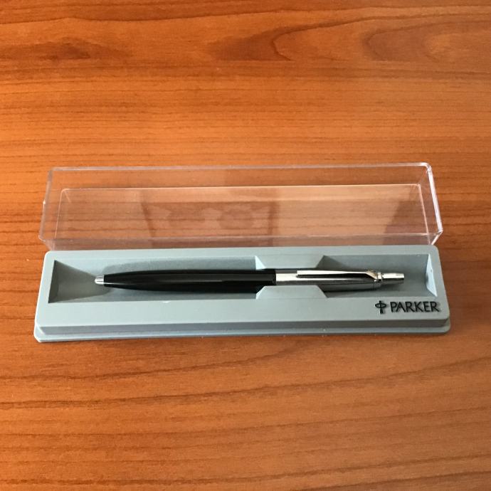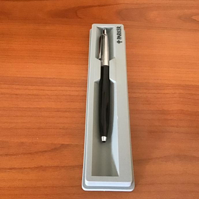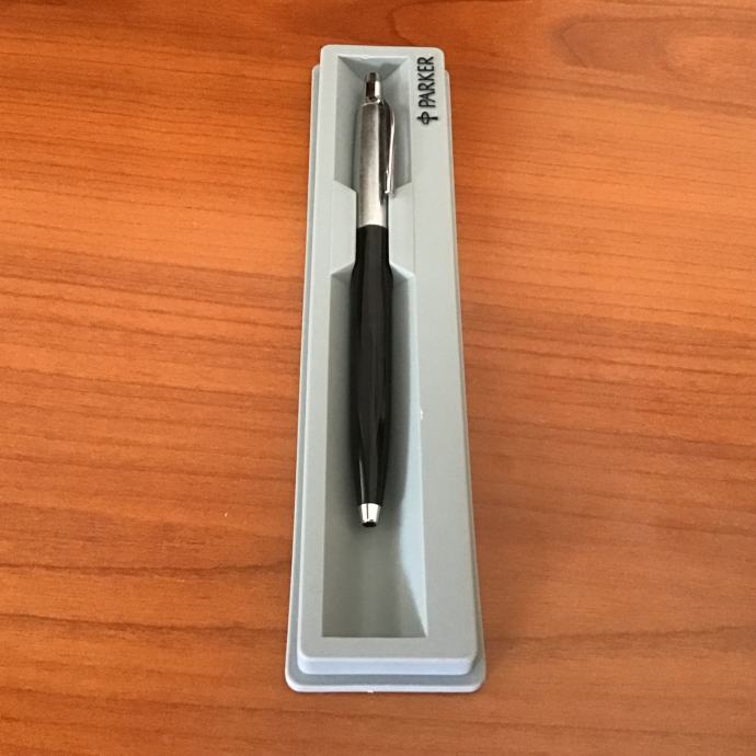 Kemijska olovka je srebrno/crne boje u poklon kutiji Parker sive boje s prozirnim poklopcem.