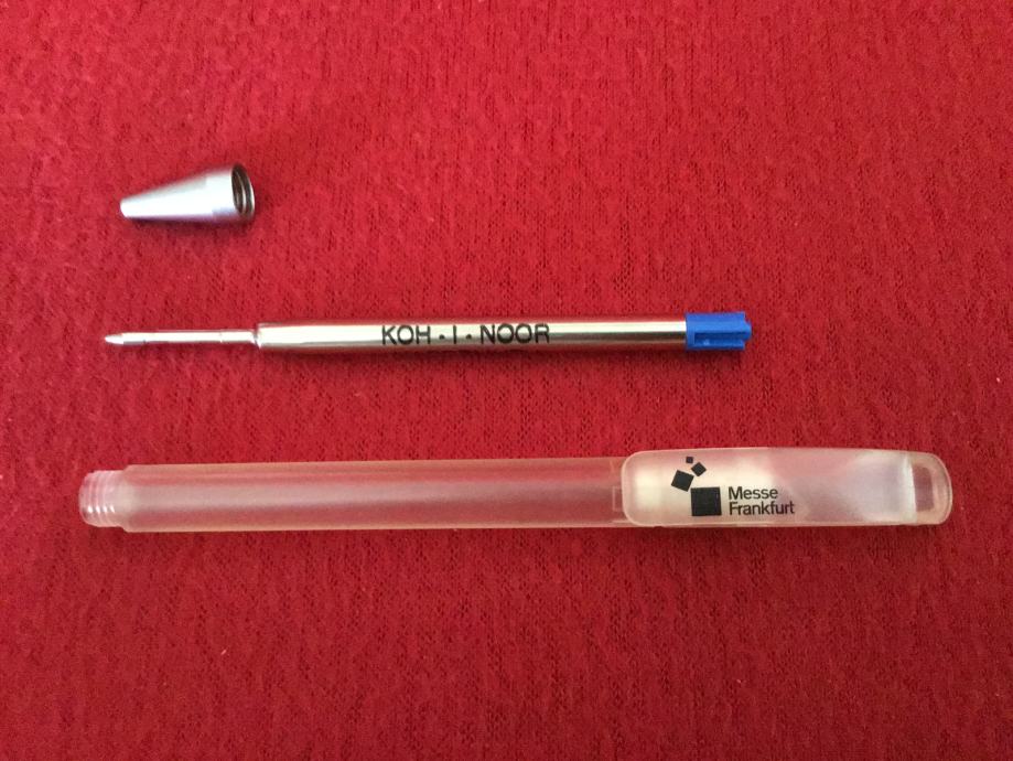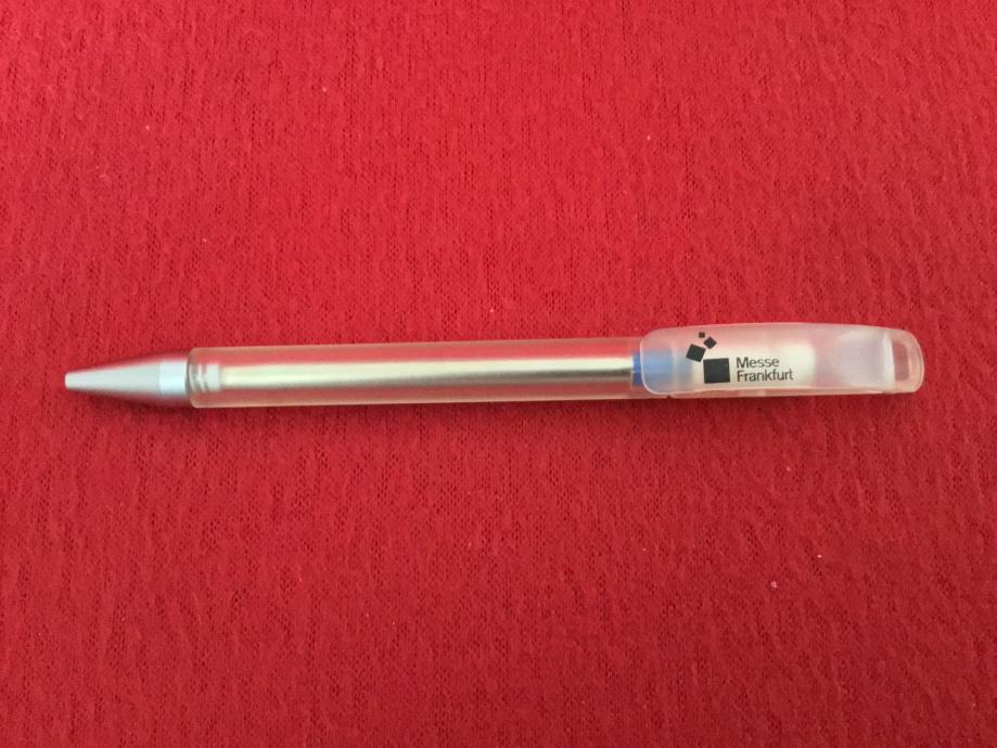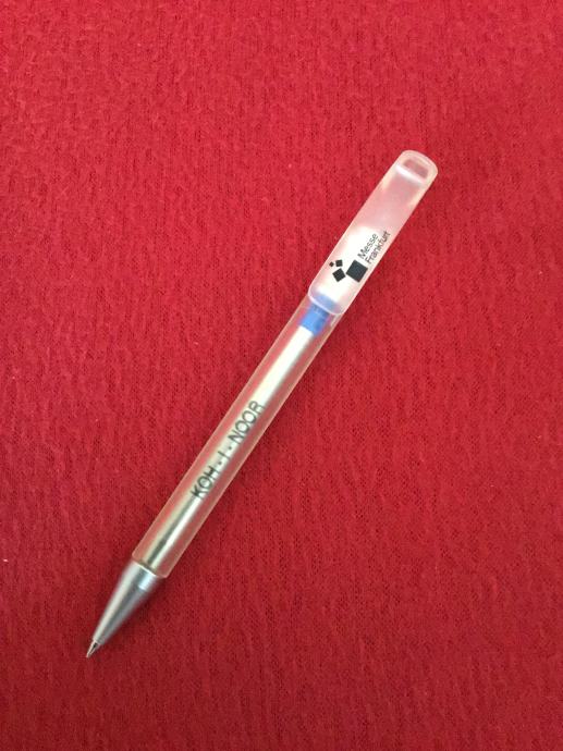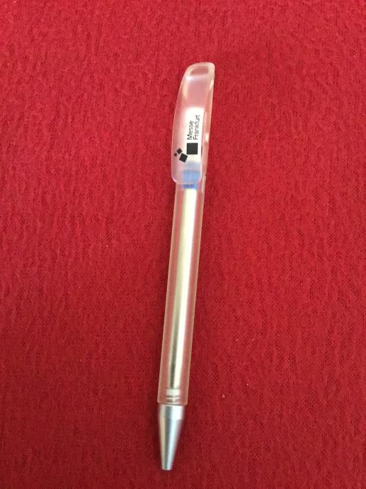Stara kemijska olovka, sive boje s logom Messe Frankfurt.