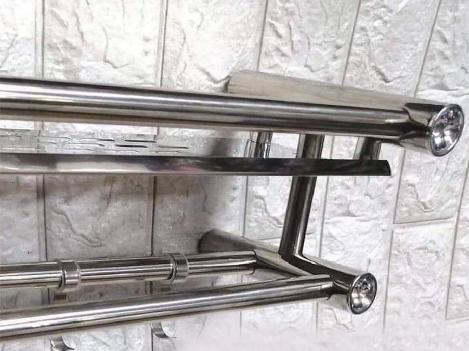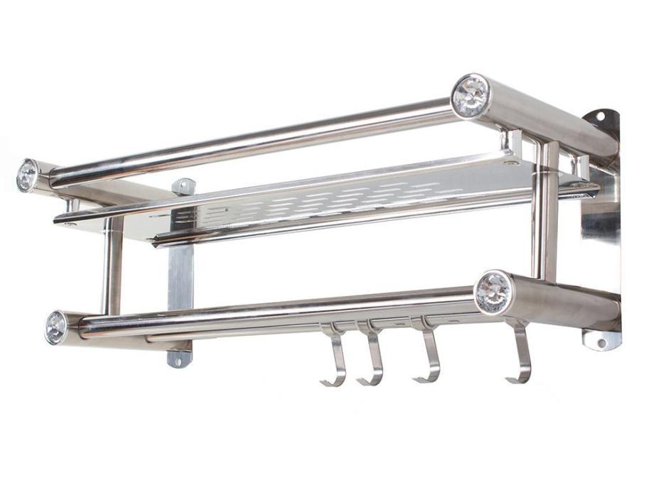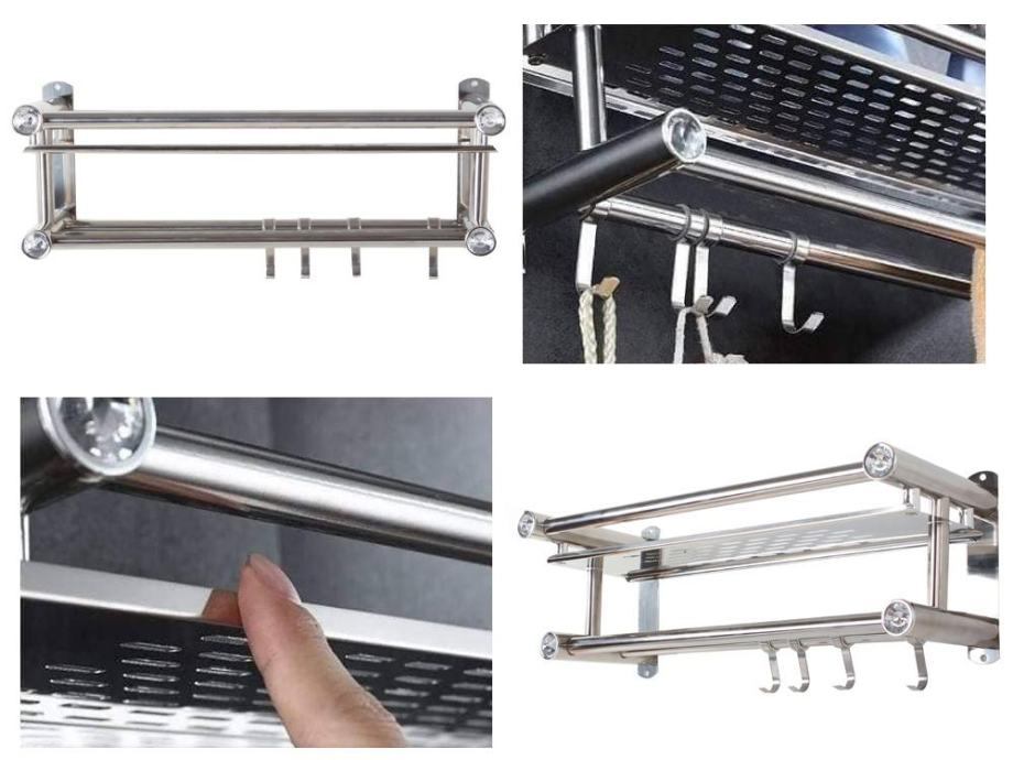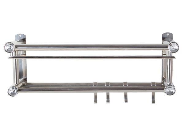 Viseće, elegantna polica za kupaonicu u srebrom. Polica ima prostranu kozmetičku policu i dva držača ručnika. Na jednoj od ograde postoje četiri vješalice.