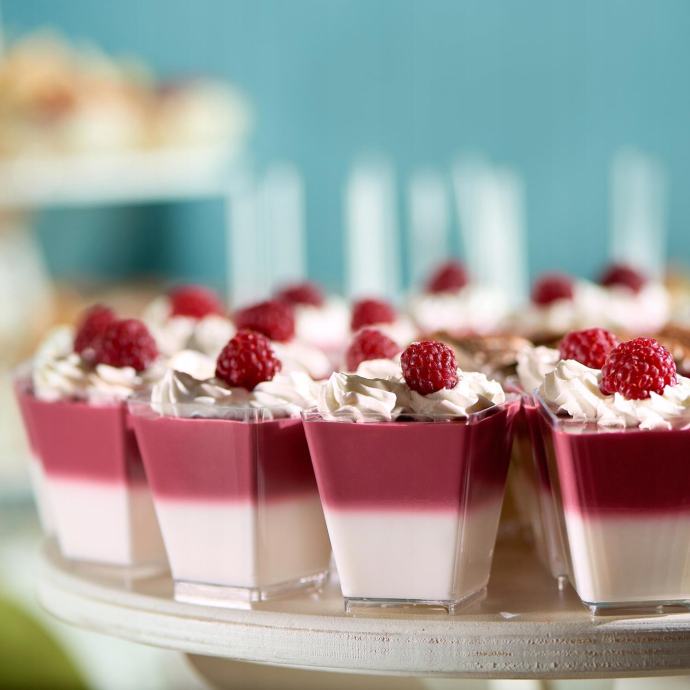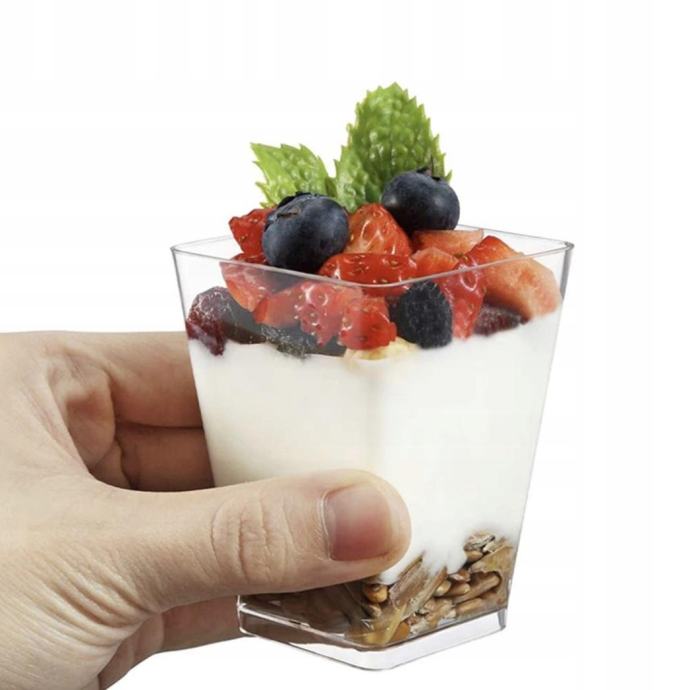 Square PVC 120ml šalice za desert u paketu od 50 komada prikladne su za upotrebu u različitim prilikama kao što su zabave, izletišta, vjenčanja i drugih događaja. Zahvaljujući njihovoj kvaliteti i funkcionalnosti, ove su šalice neophodan dodatak za bilo koji desert ili profesionalni kuhar.