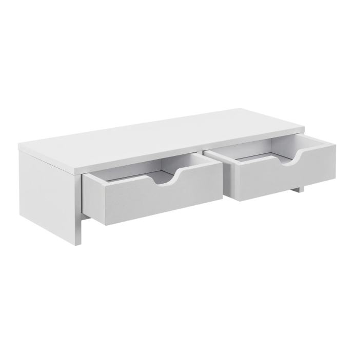 Mänttä stalak za monitor idealan je proizvod za vaš dom ili ured za povećanje visine vašeg monitora ili prijenosnog računala. Osim toga, stalak za zaslon nudi mogućnost pohranjivanja predmeta kao što je tipkovnica, što stvara više prostora na vašem stolu jer površina nije potrošena. 2 ladice pružaju dodatni prostor za pohranu.