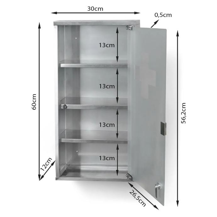 Uz ovaj četverodijelni čelični ormarić za lijekove možete sigurno pohraniti sve lijekove i druge farmaceutske proizvode koji se odnose na prvu pomoć zahvaljujući bravi na vratima. Ovaj mehanizam za zaključavanje posebno je važan za sigurnost djece u kući. Ormarić se može postaviti na željenu visinu u kupaonici, hodniku ili bilo kojoj drugoj prostoriji, jer je montaža na zid vrlo jednostavna.