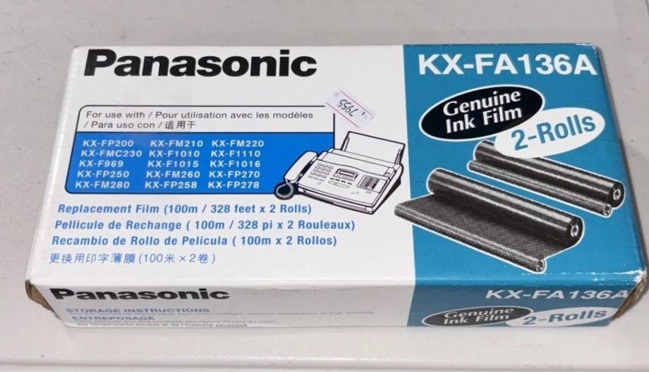 Originalni, u kutiji zapakiran karbon-film za telefax uređaje "Panasonic" - 2 role u kutiji. Na fotografiji su navedeni tipovi telefaks uređaja na koje