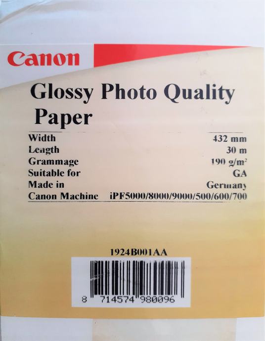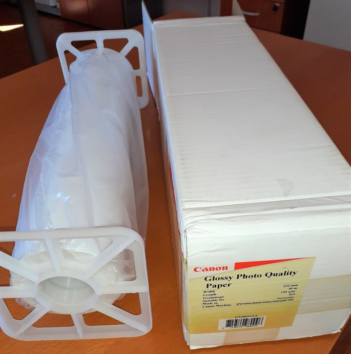 PAPIR u ROLI za ploter, original CANON "Glossy photo quality paper" original, 190 g/m2, format A2 ( širina 43,2 cm ), dužina role 30 m, 1 neotvoreni komad, cijena 58 eura.