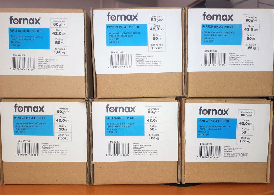 Papir u roli za ploter, standardni Fornax, 80 g/m2, format A2 ( širina 42 cm ), dužina role 50 m, 6 neotvorenih komada, cijena 59,5 eura.