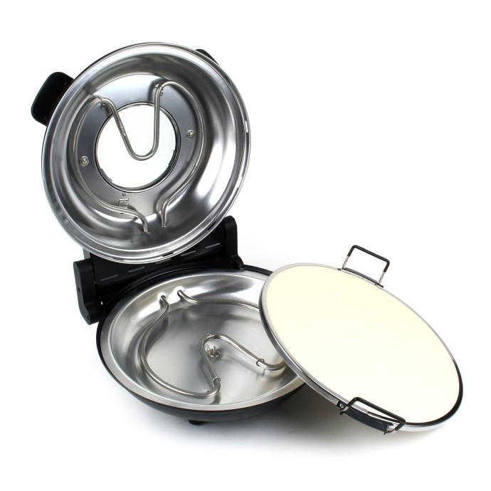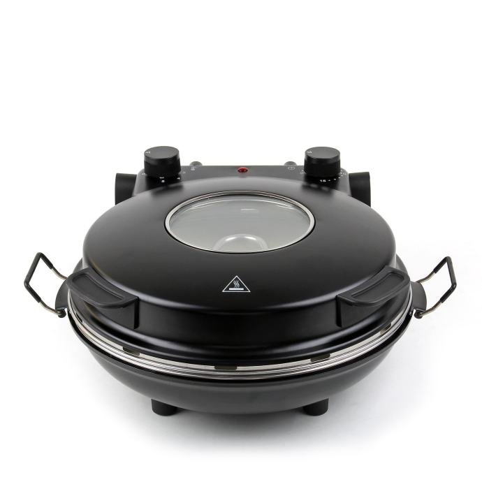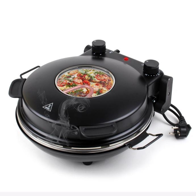 Aparat za pizzu opremljen je keramičkom kamenom pločom tako da rezultat pečenja može slijediti rezultat profesionalne pećnice. Ovaj ima promjera 32 cm i osigurava da tijesto ne postane previše mekano i ne gori. Budući da kamen apsorbira višak vlage iz tijesta i pohranjuje toplinu iz pećnice, što je ravnomjerno emitira kako bi baza bila lijepa i hrskava. Nakon otprilike 15 minuta, kućna pizza spremna je za pečenje, a smrznuti pizza ima vrijeme pečenja šest do osam minuta.
