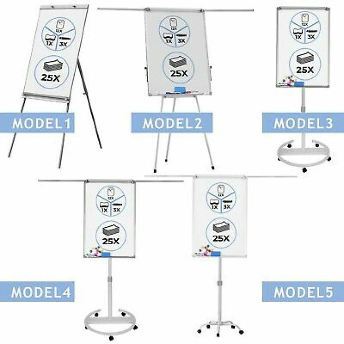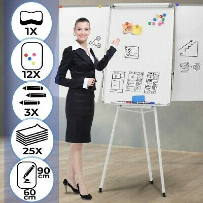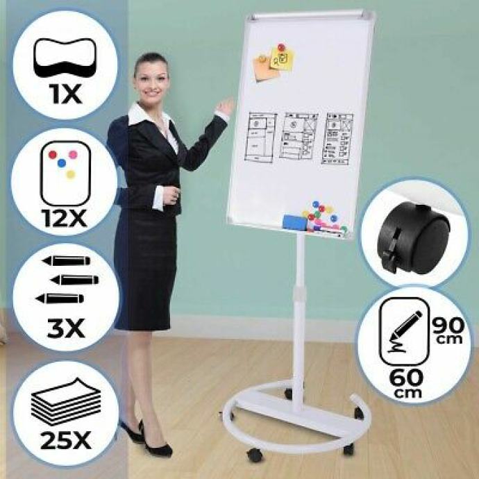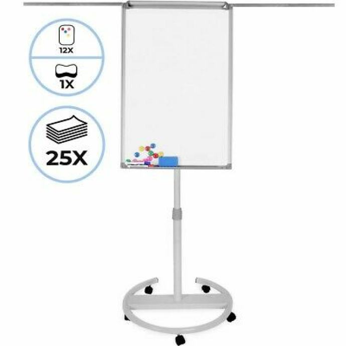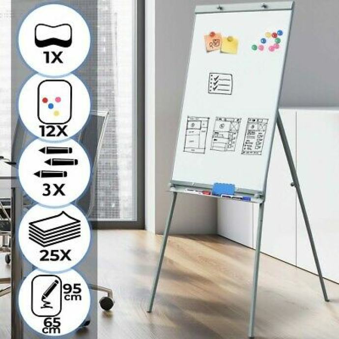 Jasne bilješke neprocjenjive su vrijednosti za učinkovito razmišljanje kod kuće, na seminarima ili u uredu. Naš flipchart savršen je za posao! Svojom izdašnom površinom nudi prostor za komentare, crteže i slično. Olovke i flomasteri mogu se jednostavno spremiti u integrirani pretinac. Uz to, površina suhog brisanja flipcharta presvučena je magnetskom bojom, tako da možete dodati slike ili plakate s isporučenih 12 magneta. Visina se može ručno podesiti između 163 i 210 cm ili od 103 do 165 cm, ovisno o modelu.
