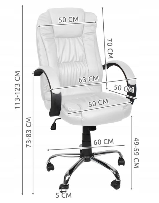 Specifikacija- Boja materijala: bijela; Materijal: Eco koža; baza: kromirani čelik; Okvir: plastika; Bicikli: guma; Mehanizam: poluga (leptir); Dimenzije (duljina / širina / visina): 60/63 / 123cm; Podešavanje visine: 113-123cm; Maksimalno opterećenje: do 130 kg; Težina fotelje: 16 kg