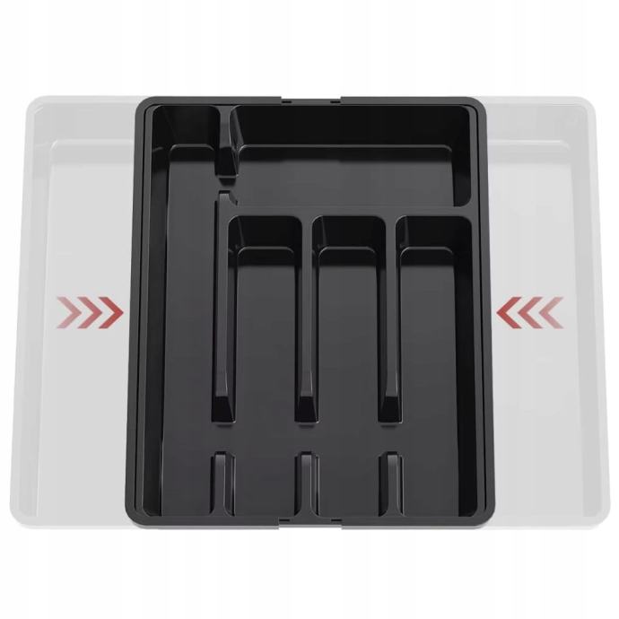 S opsežnim dizajnom, organizator se prilagođava širini ladice do 44 cm, što omogućava maksimalnu fleksibilnost. Izrađen od kvalitetnog crnog materijala, ima moderan izgled koji odgovara svakoj kuhinji.