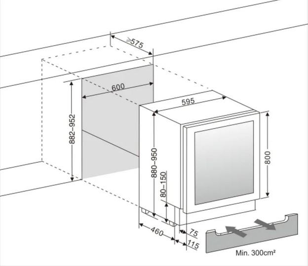 Hladnjak za vino dizajniran je za jednostavnu ugradnju ispod kuhinjskog pulta, a vrata pristaju u ravnini s vratima kuhinjskog elementa za elegantan i neprimjetno integriran izgled.