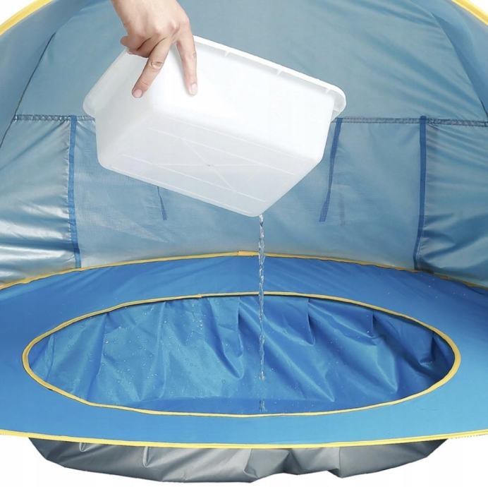 Ugrađeni bazen- Osim toga, dno šatora opremljeno je vodootpornim platnenim bazenom koji se može koristiti za igranje vode ili kao kutija s pijeskom. Dovoljno je iskopati rupu bazena na plaži i staviti šator na nju.