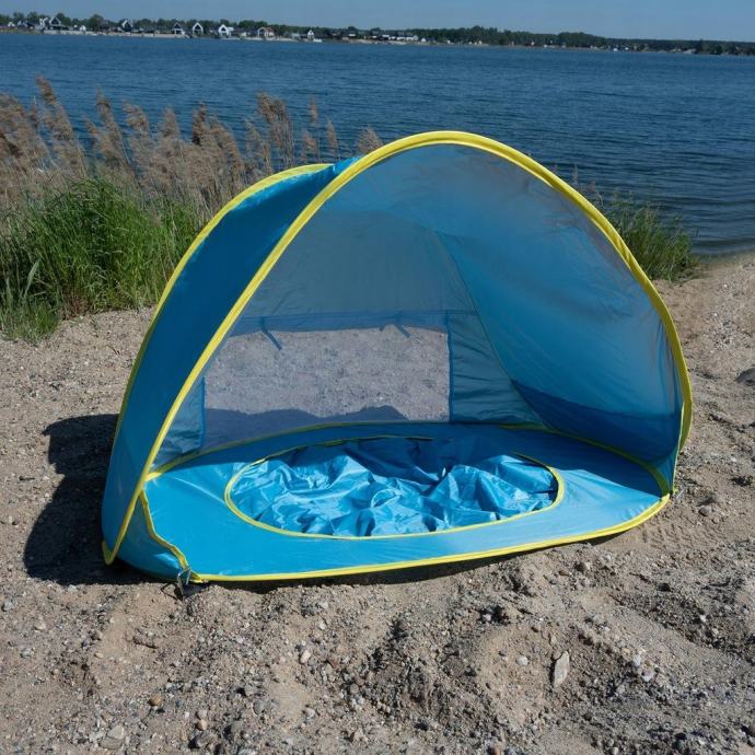 Polupsirani pop up up šator za plažu s bazenom savršena je kombinacija kišobrana i parave s bazenom, ali mnogo je prikladnije koristiti i zauzima mnogo manje prostora, što je važno prilikom pakiranja prtljage. Štiti od vjetra i prejakog sunca. Ovo je važno ako s djecom odete na plažu i želite im pružiti siguran odmor. Bazen je ugrađen u dno šatora. Dovoljno je iskopati jamu, sipati vodu i dijete može mrmljati.