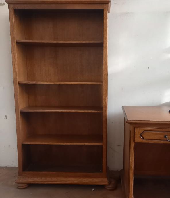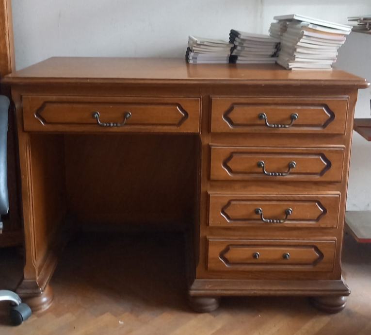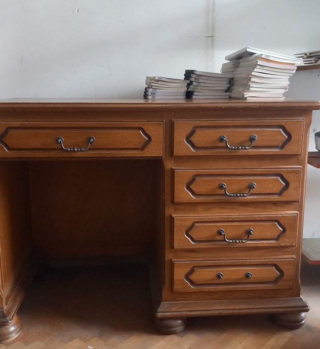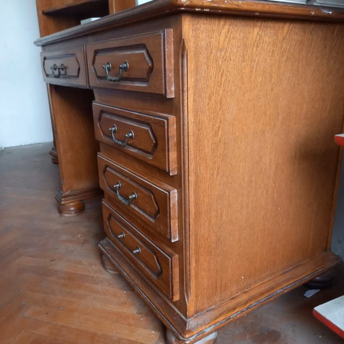 Prodajem predivan, masivan i sarmantan pisaci/radni stol izrađen od punog hrasta. Kvalitetna hrvatska izrada. 20ak godina nas je sluzio u nasoj radnoj biblioteci. U izuzetno je dobrom stanju. Naravno, postoji koja ogrebotina, vidljivo na slici. Stol ima pet manjih ladica i jednu veliku, sve subpotpuno funkcionalne. Riječ je o čvrstom, elegantnom komadu namještaja koji se uklapa u klasične i moderne interijere. Prodajem ga zasebno ili u kompletu sa policama koje su takodjer objavljene. Oko cijene se mozemo dogovoriti. Police i stol su bile dio nase divne interne biblioteke. :) Osobno preuzimanje u Zagrebu.