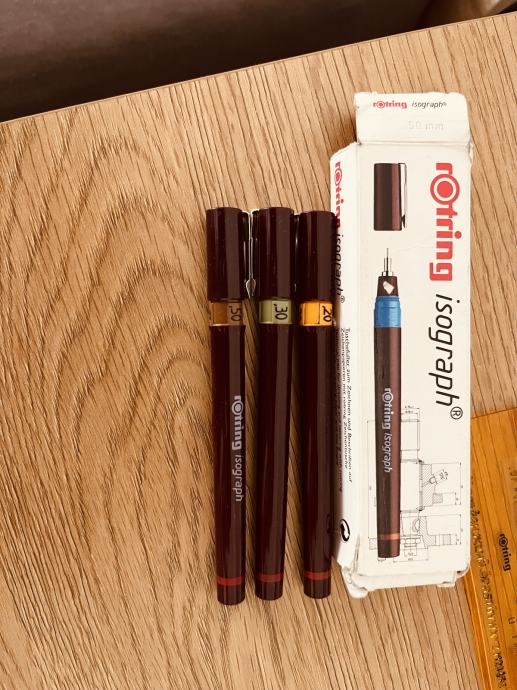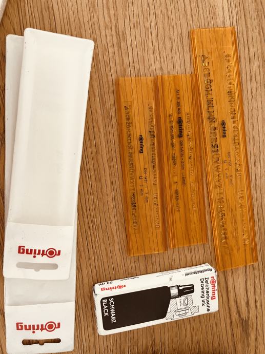 Prodajem rapidografe debiljine 0.5, 0.3 te 0.2mm, sablone za pisanje za navedene rapidografe te punjenje za rapidografe, crna tinta.