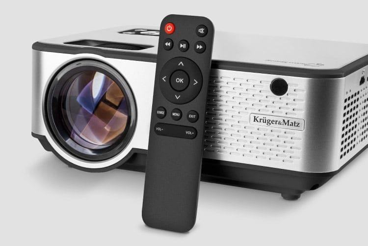 Kućni projektor Kruger & Matz V-LED50 također je prikladan za upotrebu. Komplet uključuje daljinski upravljač, zahvaljujući kojem možete odabrati izvor reprodukcije ili prilagoditi glasnoću bez ustajanja s kauča.