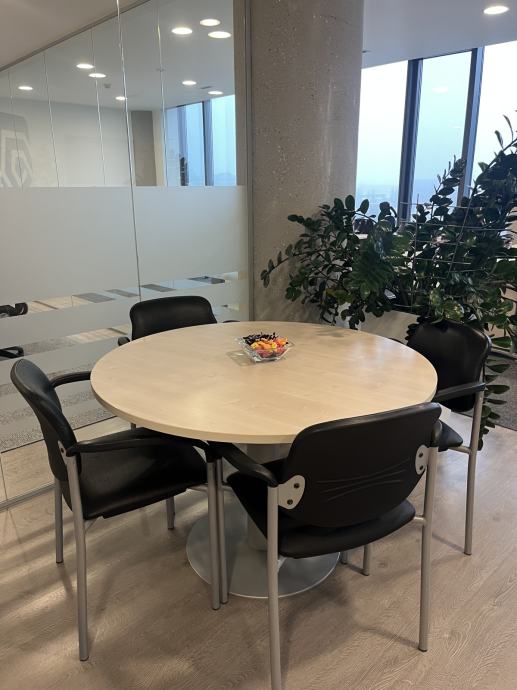 Radi se o lijepom uredskom stolu boje breze za sastanke s 4 stolice. I stol i stolice su u vrlo dobrom stanju, dok tkanina na stolicama traži renovaciju (pogledajte na slici). Promjer stola je 115 cm. Cijena kompleta je 300 eura.