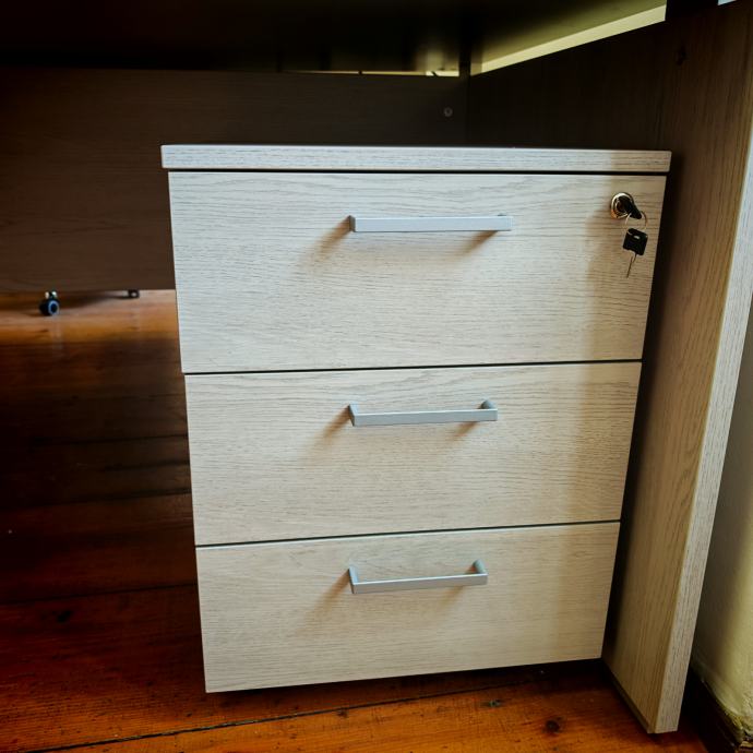 - ormarić sa tri ladice, i bravom, na kotačiće, ispod radnog stola, dimenzije 43x55xH58, 2 kom. Cijena bez pdv-a 88€