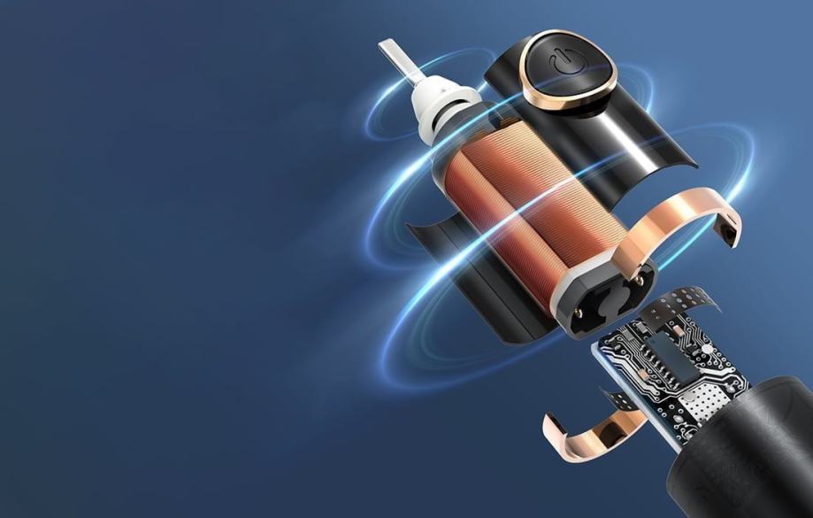 Četkica za zube opremljena je moćnim motorom koji može stvoriti vibracije do 62.000 u minuti u čistom načinu rada. To znači da uklanja ostatke i mrlje brzo i učinkovito. Također dopire do soba između zuba. Može očistiti desni do 10 puta učinkovitije od uobičajene četkice za zube i 3 puta učinkovitije od električne četkice za zube. Također ne morate pratiti vrijeme čišćenja. Pametni tajmer podsjetit će vas svakih 30 sekundi kako biste promijenili područje koje četkate. Nakon 2 minute, četkica za zube automatski prestaje raditi.