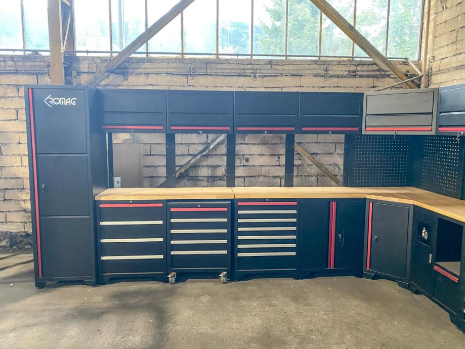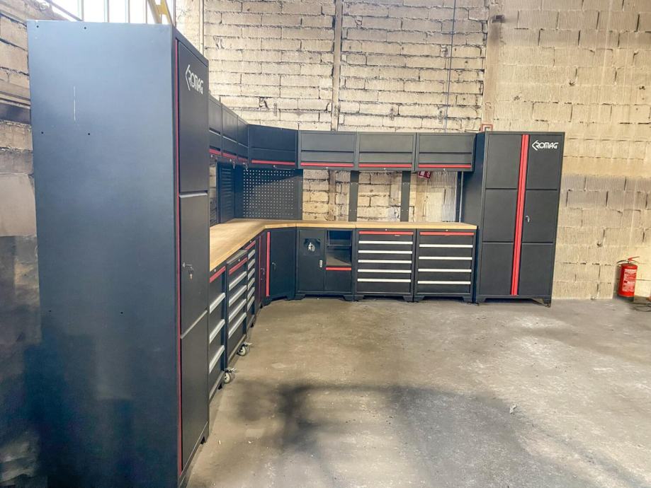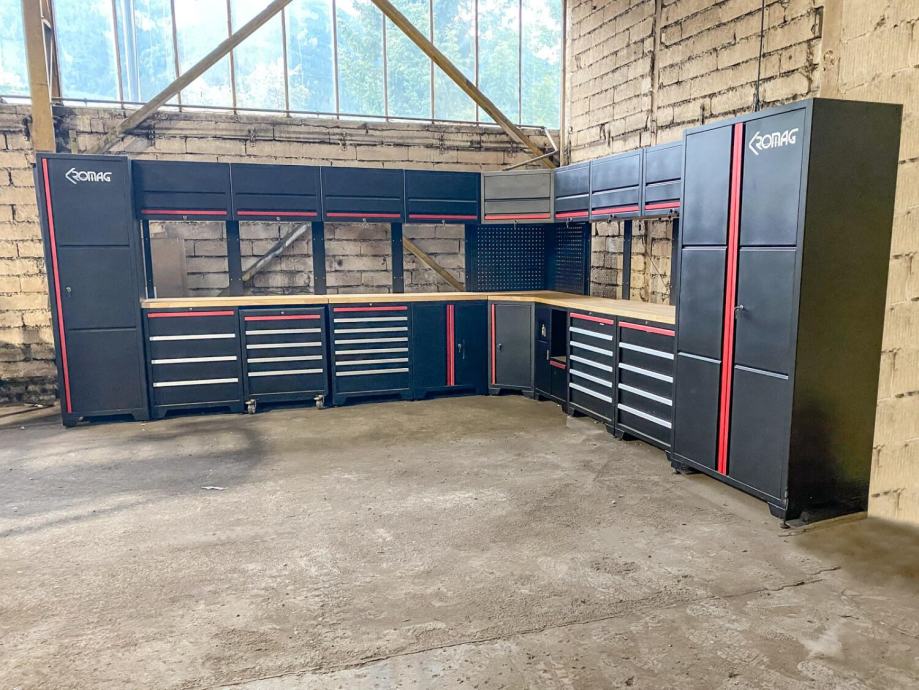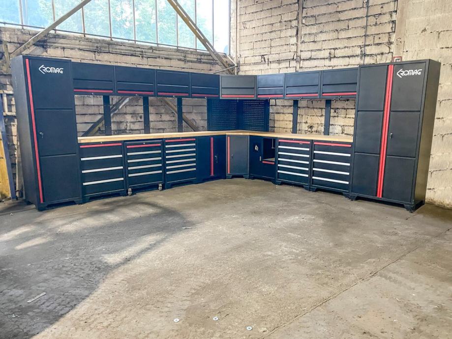 cca 8 m (visina 2045 mm, dubina do 565 mm), za pojedinačnu montažu (moguće duže/kraće stranice), samostojeći (svi elementi su međusobno spojeni - nije potrebno zidno montiranje), LED rasvjeta, sastoji se od: ormara, jednokrilna (600/ 507/1956 mm), ormara s 2 vrata (915/565/1956 mm), 7 zidnih ormara (711/330/457 mm), zidnog ormarića kutnog elementa (832/832/456 mm), donji ormarić s držačem papira i ladicom za otpad (711/507/820 mm), donji ormarić s 2 vrata (711/507/820 mm), donji ormarić s 4 ladice (711/507/820 mm), donji ormarić s 5 ladica (711/ 507/820 mm), donji ormarić sa 6 ladica (711/507/820 mm), donji ormarić sa 7 polica (711/507/820 mm), kolica za alat s 5 polica (666/458/748 mm), kutni element donjeg ormarića (832 /832/820mm), podni element kutni element radna ploča (832/832/38mm), 4 radne ploče (1422/507/ 38mm), 1 radna ploča se mora skratiti za montažu!Kutni element stražnjeg zida (832/641/25 mm), kutni element stražnjeg zida (807/641/25 mm), 3 potporna elementa (50/15/1955 mm), 9 potpornih elemenata (110/15/1956 mm), 4 LED magnetne svjetiljke (ne vidi se na fotografiji) s napajanjem 230V/12V ukupno cca 830 kg (sa originalnim pakiranjem 920 kg, 8 m3)