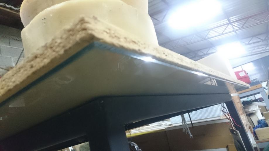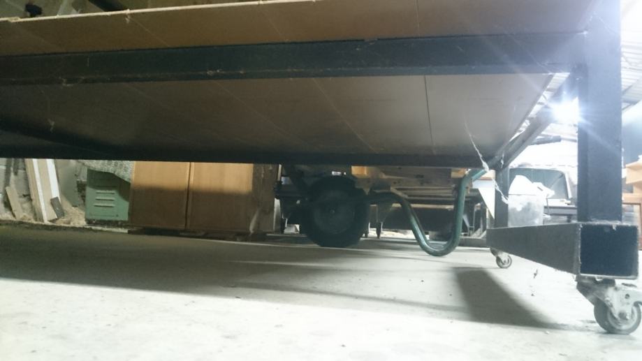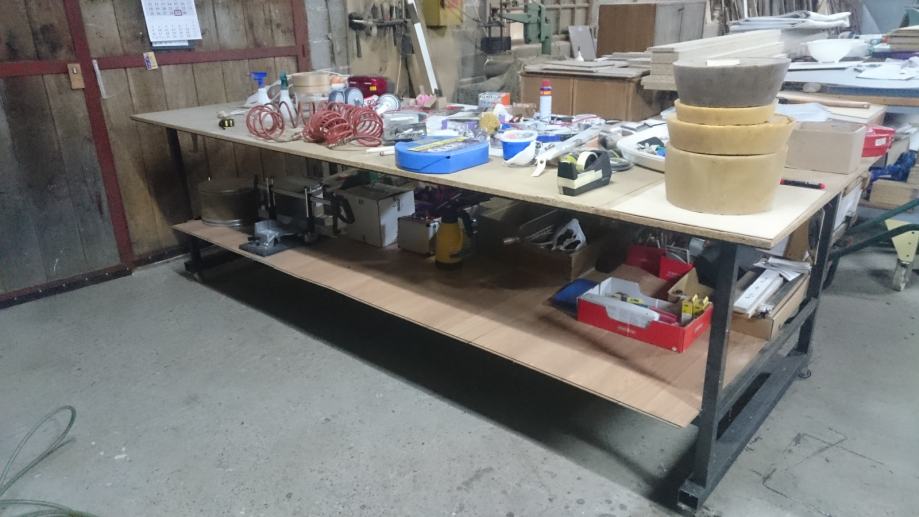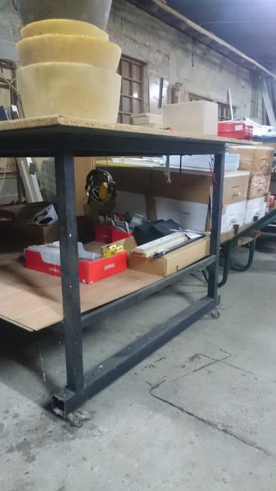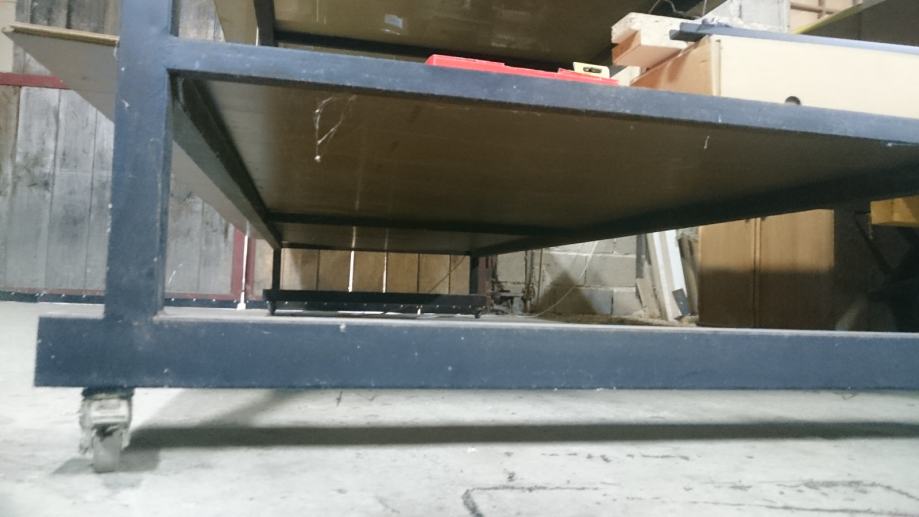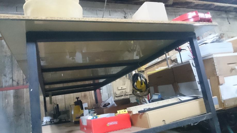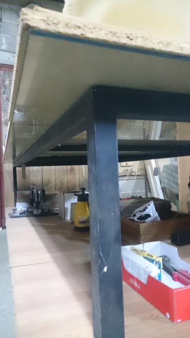 Stol ima gore kaljeno staklo 6mm, a dolje policu cijelom širinom i dužinom. Sada je na staklu iverica zbog zaštite. Čelična konstrukcija obojena u crnu boju. Samo staklo košta 2000 kn.Stanje kao novo..može zamjena.