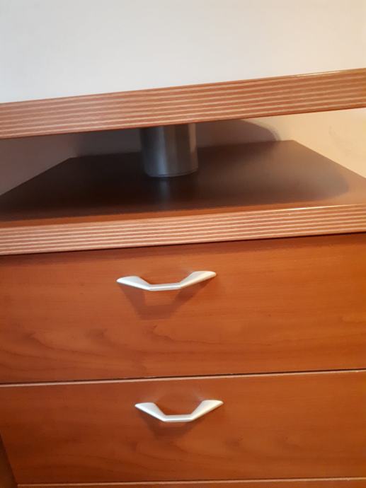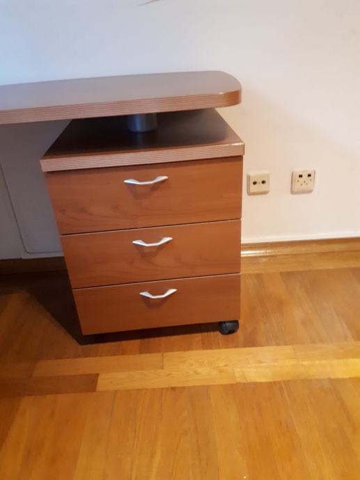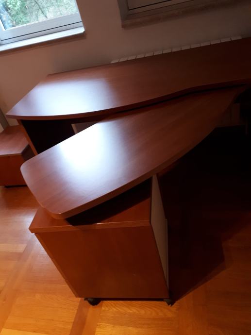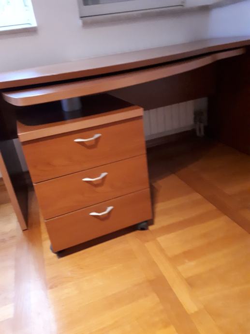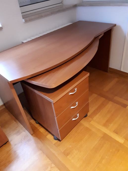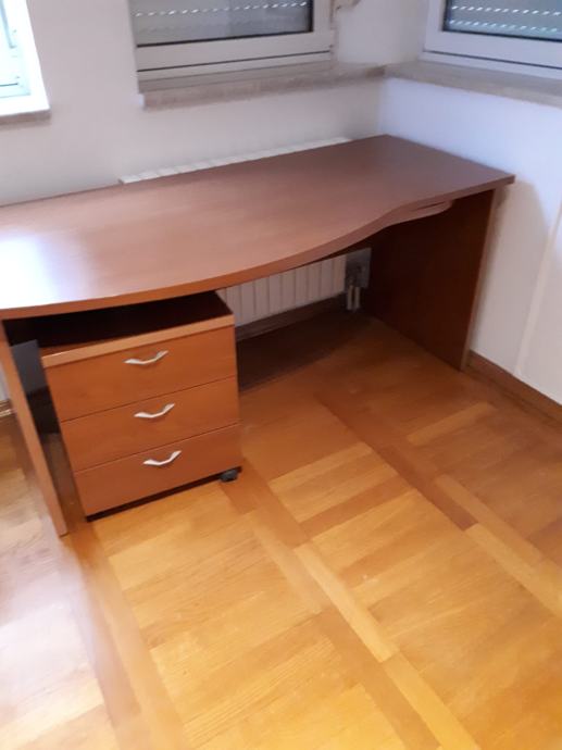 radni uredski stol; marke Berloni - kvalitetan dizajnerski , dimenzije ; duzina 1.50 m, sirina 60, a prošireni dio 71 cm. Visina stola73 cm.Stol ima izvlačni dio koji se na kotačima izvuce u slovo L desno i ladicar ispod. (3 ladice) Izvlacni dio duzina:90cm, širina 43 cm, a prošireni dio 50 cm.Ladicar dimenzije 45x45 cm. Visina izvlacnig dijela je 65 cm. Cijena 300 eura