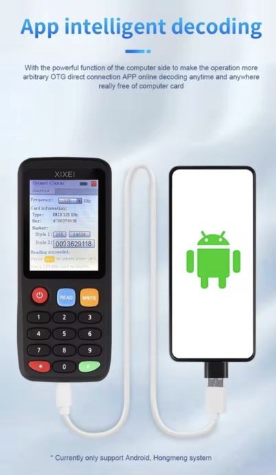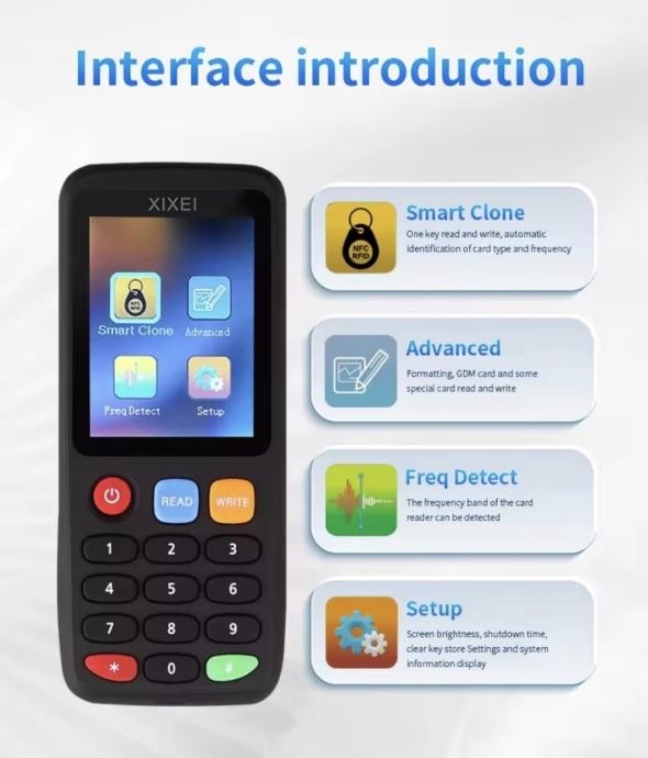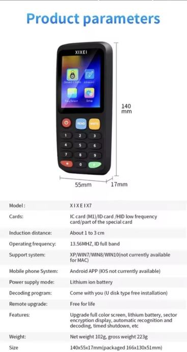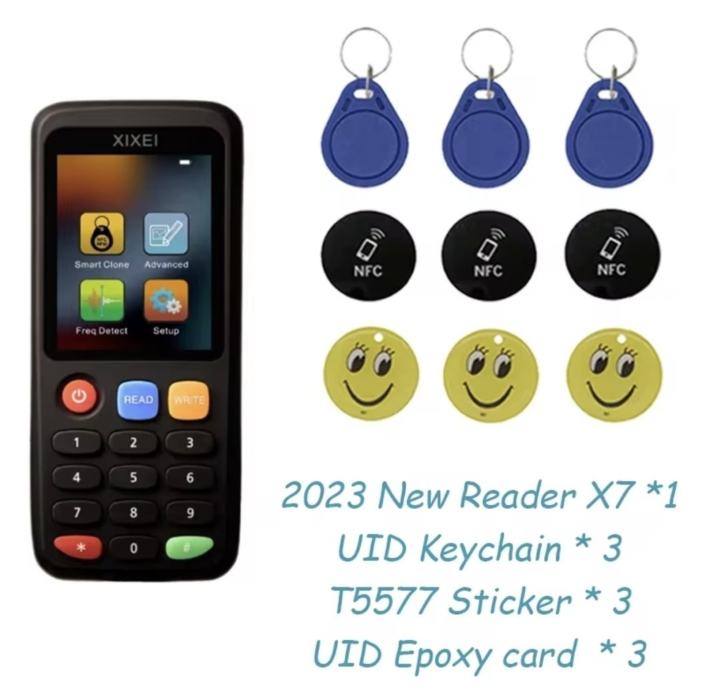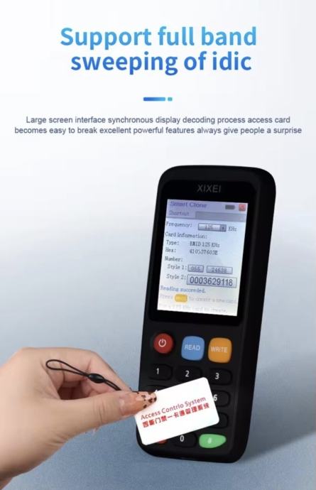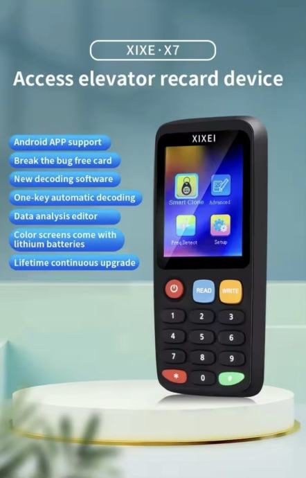 Prodajem najnoviji model univerzalnog RFID i NFC čitača/pisca (XIXEI X7). Ovaj moćni ručni uređaj omogućuje vam da jednostavno kopirate gotovo sve vrste pristupnih kartica, privjesaka (tagova) i narukvica koje se koriste za ulazak u zgrade, liftove, garaže ili urede.