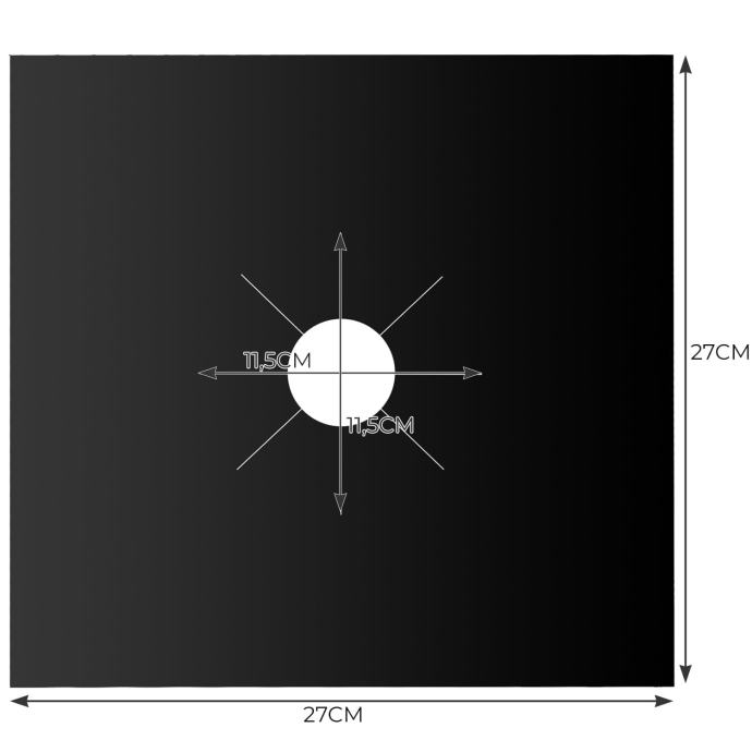 Specifikacija -kolor: crna; Materijal: teflon; Promjer rupe: 4,5 cm - 11,5 cm; Dimenzije: 27 x 27 x 0,2 cm; Težina: 90 g; Težina u paketu: 100g.