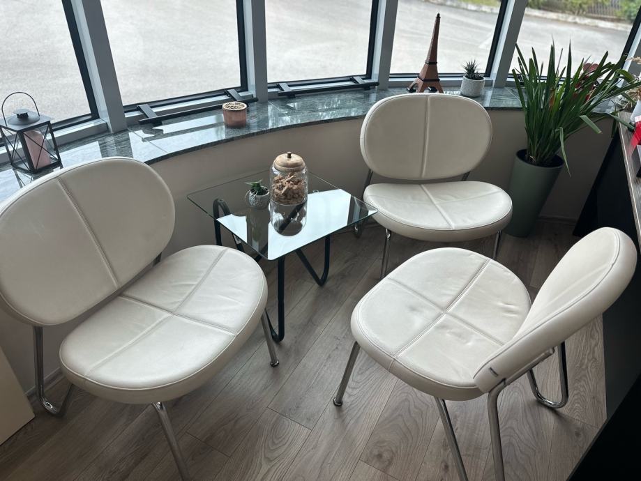 Prodaje se kao cijeli komplet. Tri kožne fotelje i stakleni stolić. Kvalitetna koža, vide se sitni tragovi korištenja, udobno i lijepog izgleda.