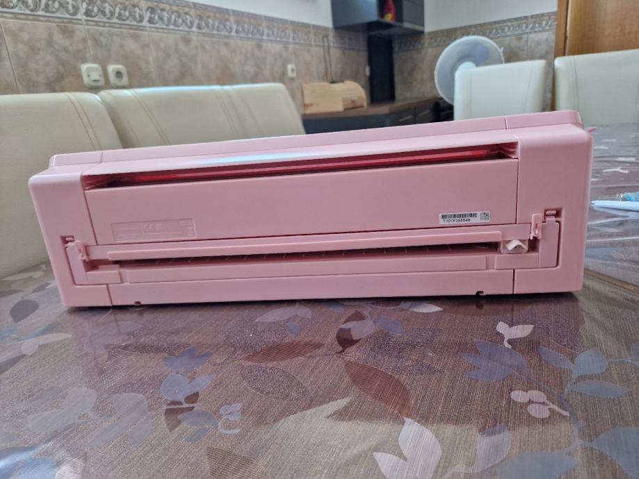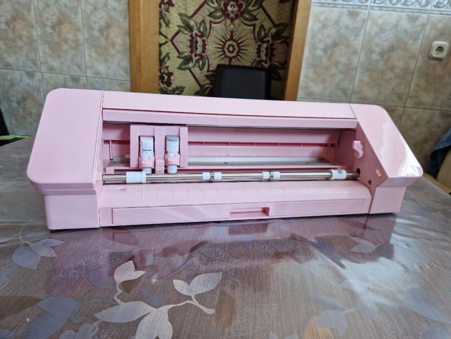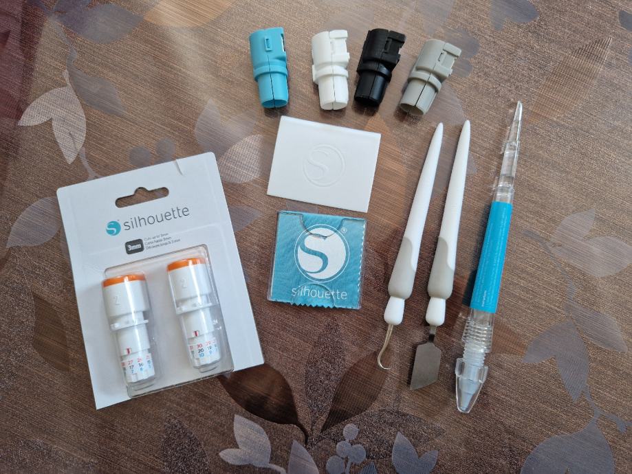 Uz njega poklanjam dva noža za kožu (jedan korišten par puta), jedan rotirajući, dvije ploče za rezanje na kojima je minimalno rezano, dodatke za rezač sa slika, folije za rezanje (za tekstil).