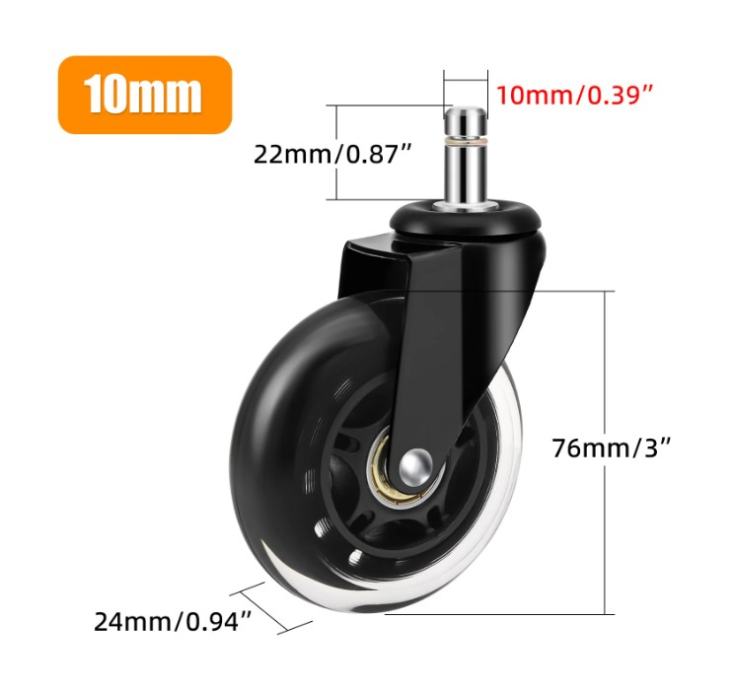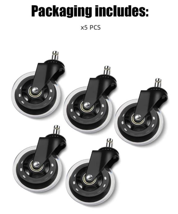 Set sadrži 5 kotačića, koje možete odmah pričvrstiti na bilo koju uredsku stolicu sa standardnim otvorom za montažu od 10 mm i iglom od 22 mm