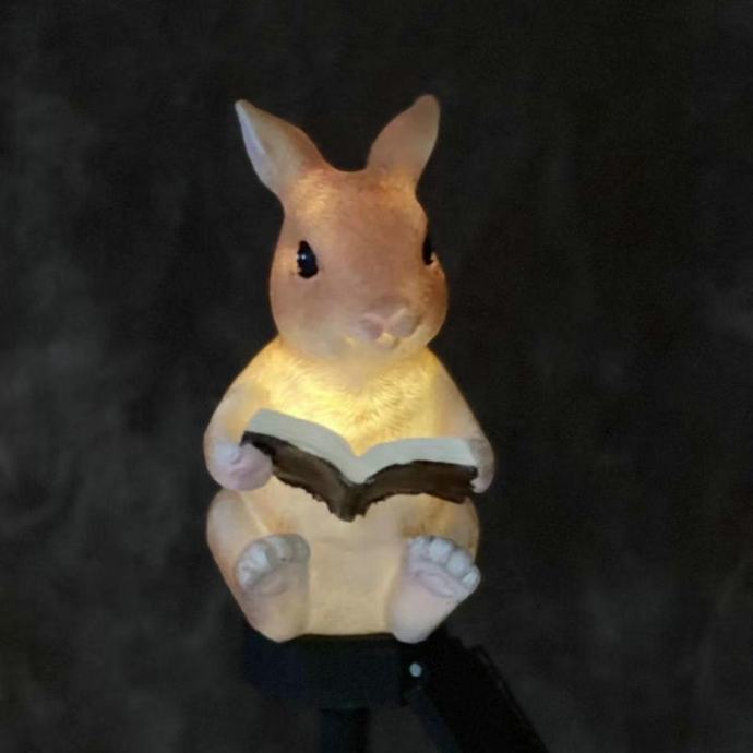 Neobična solarna LED zečja vrtna svjetiljka koja čita knjigu. Izvrsni ukrasni element. Lampica se napaja solarnom energijom, koja uz pomoć solarne ploče ispunjava ugrađenu bateriju. Uređaj se automatski započinje kada je uzemljenje (opremljen sumrakom), a puna baterija dovoljna je za do 8 sati kontinuiranog rada. Svjetiljka ima LED koja emitira bijelu svjetlost. Snažan savjet omogućuje pouzdanu i brzu ugradnju svjetiljke u podu, a vodootporno kućište omogućuje glatku upotrebu bez obzira na vremenske prilike.