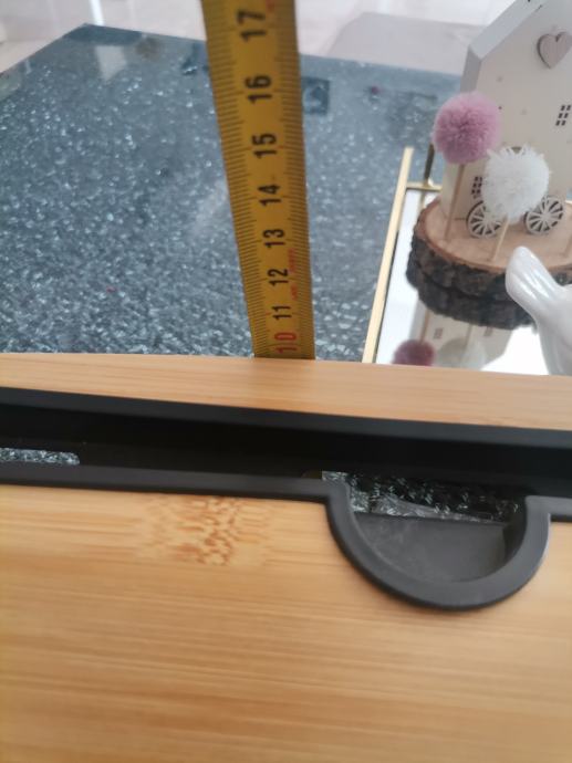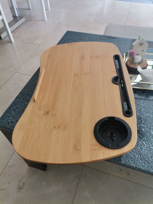 Ima utor za tablet/mobitel, držač za olovku te kružni držač za šalicu ili čašu.