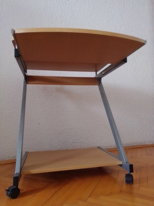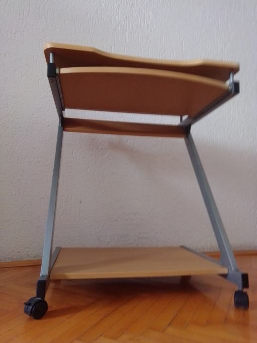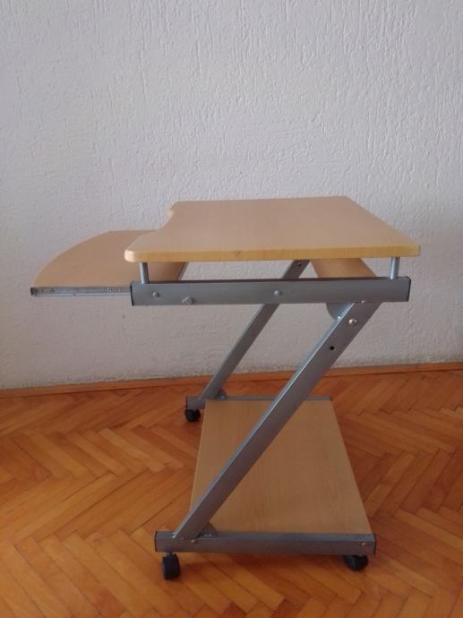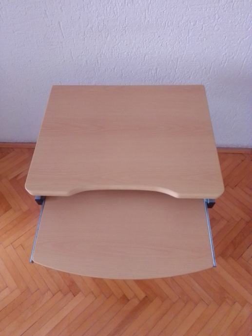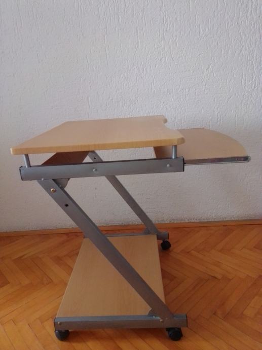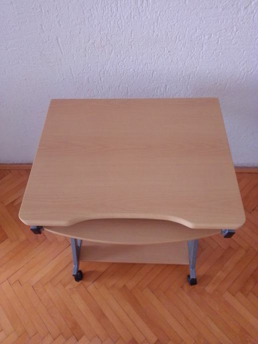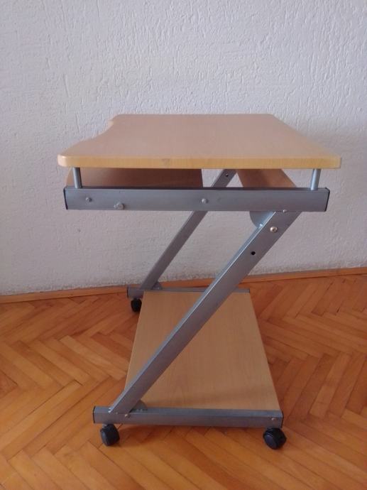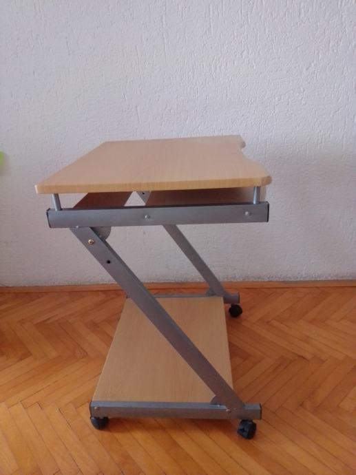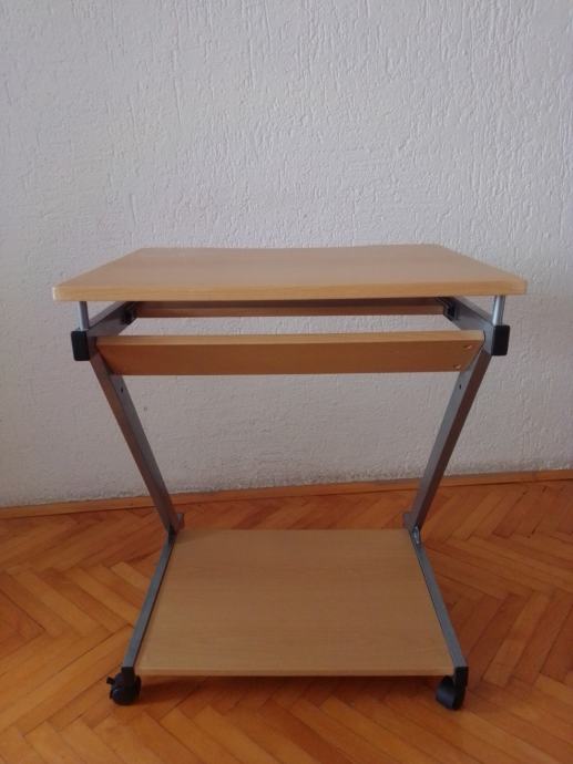 prodajem stolić za kompjuter. Okvir metalni, radna ploha drvena, crni kotači. Dobro očuvan, malo korišten.Dimenzije: visina 72cm, dužina 60cm, širina 48cm.