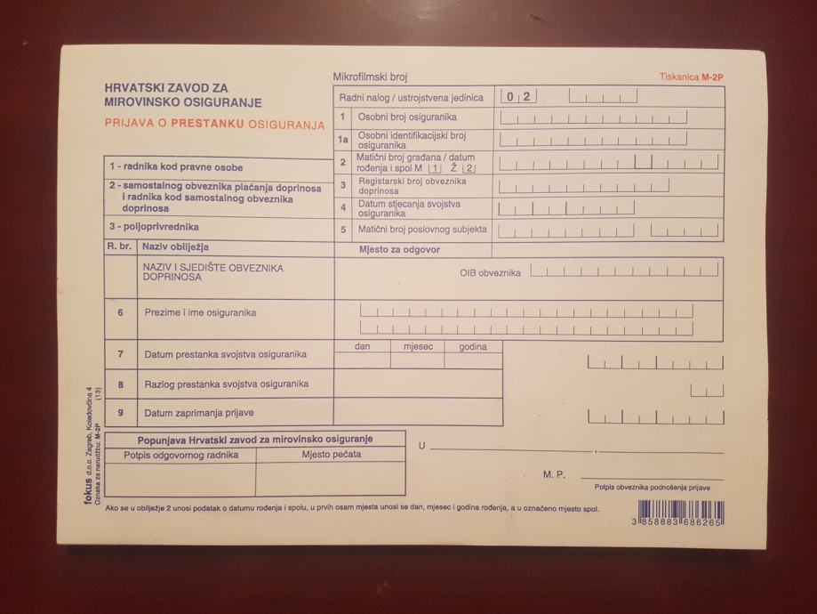 HZZO prijava o prestanku osiguranja M-2P - 0,30 € kn (25)