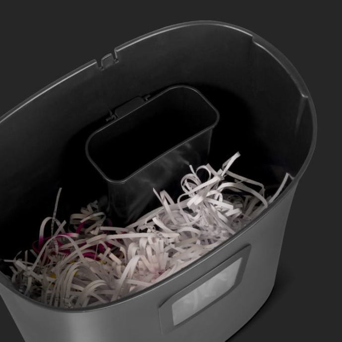 Važan element razarača dokumenata je 21-litrena kanta za smeće, čiji veliki volumen znači da ga nećete morati često isprazniti. Mnogo udobnosti je uklonjiva ručka s ručicom koja izuzetno lako isprazniti košaru.