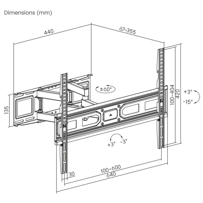 Zahvaljujući povlačenju, također je moguće prilagoditi udaljenost na zid od 67 do 355 mm. Pored toga, držač se može zakretati za ± 3 °. To znači da se položaj zaslona nakon instalacije može popraviti za nekoliko stupnjeva. Napomena: U rasponu isporuke uključeni su ugrađeni materijal i ravnoteža vode za točno naselje.